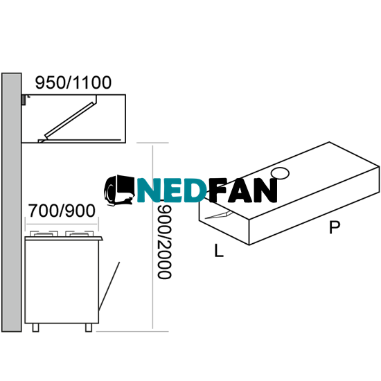 - De afzuigkap is rechthoekig en de filters zijn gemonteerd met een hoek van 45 °