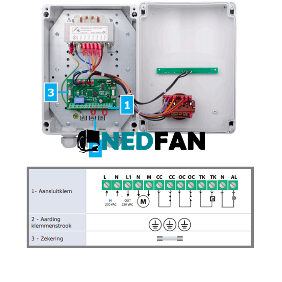 Wij verkopen geen spullen voor criminele doeleinden! Traforegelaars De 5 standen traforegelaars regelen de rotatiesnelheid van monofasige, voltage-aanstuurbare motoren door de uitgangsspanning te variëren. Ze zijn uitgerust met autotransformator(en) en regelen de snelheid handmatig in vijf stappen. Ze beschikken over TK bewaking voor thermische motorbeveiliging (5 standen traforegelaars met thermische beveiliging), droge contactingang voor starten / stoppen op afstand en een 230 VAC alarmuitgang. De technologie biedt een gereguleerde uitgangsspanning met een perfecte sinusoïdale vorm. De 5 standen traforegelaars tot 7.5 ampère 230 volt zijn verkrijgbaar in een plastic behuizing, terwijl de modellen boven 7.5 ampère 230 volt verkrijgbaar zijn in een metalen behuizing. 5 standen traforegelaars voor ventilatoren Breed voedingsspanningsbereik 2.5 ampère — 20.0 ampère, 5-staps draaischakelaar voor handbediening met uit-positie, ingang – TK bewaking voor thermische motorbeveiliging, de regelaar start automatisch terug op na een stroom onderbreking, alarm output, LED-indicaties, ingang voor externe aan / uit-schakelaar, ventilator standenregeling van regelbare motoren in ventilatiesystemen, uitsluitend voor binnen gebruik.
